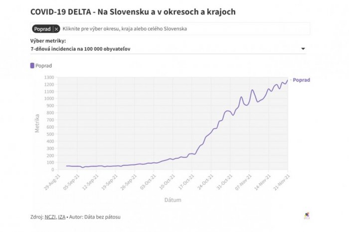 Čísla z webu Dáta bez pátosu zobrazujú nárast nových prípadov v okrese Poprad od augusta tohto roku. Podľa krivky je zjavné, že stále šplháme na vrchol.