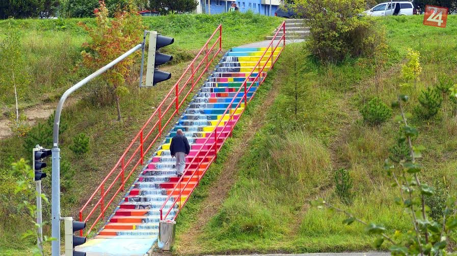 Galéria Adrián Kromka pri maľovaní schodov v Poprade