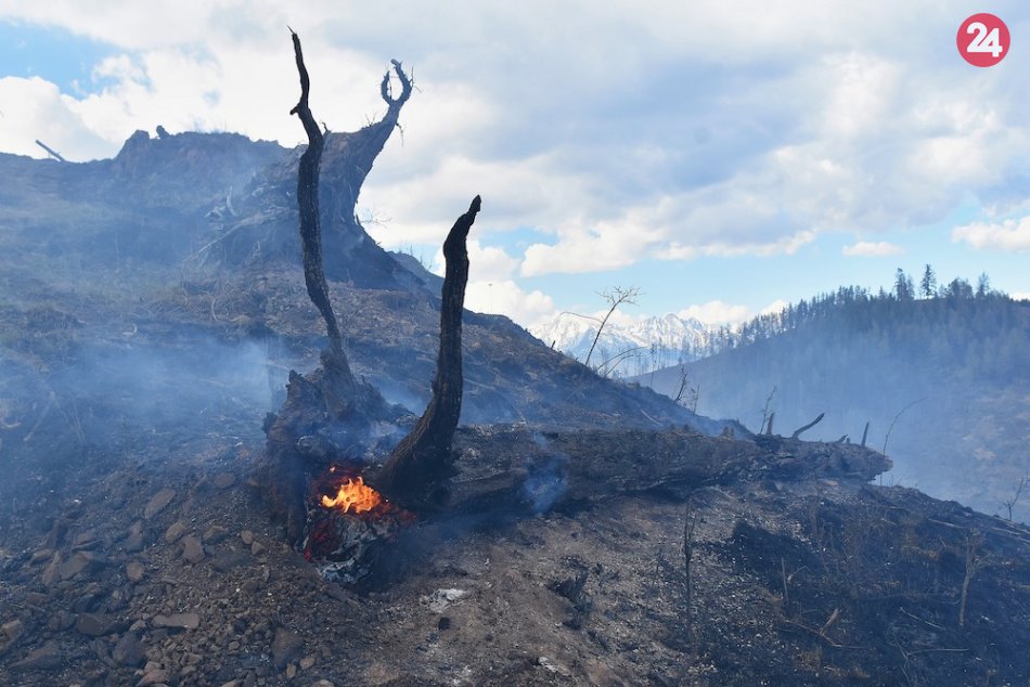 Galéria FOTO z požiaru v Kravanoch: Hasiči bojujú s ohňom v ťažkom teréne