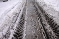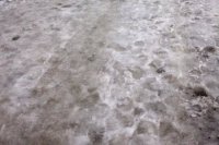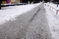 Snehová kaša a mláky na chodníkoch. Ulica J. Curie - hlavný chodník pri nemocnici, Ul. L. Svobodu - nedeľa 24. 2. 2013. Mestská správa komunikácií v tento deň neodhrnula minimálne veľkú časť sídliska JUH.