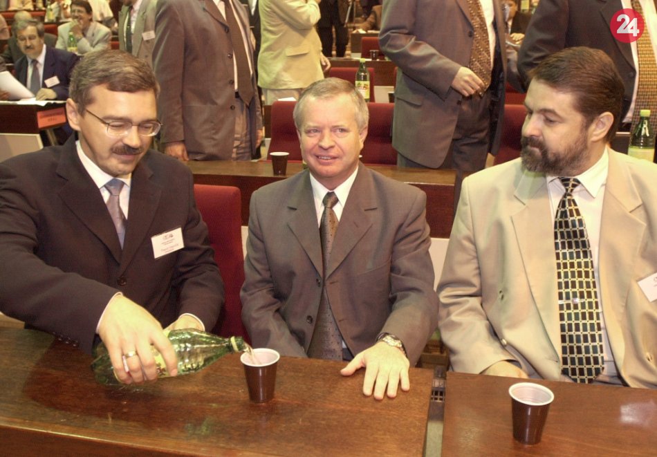 Republikový kongres Strany občianského porozumenia (SOP) 20. mája 2000 v Poprade . Na snímke zľava predseda SOP Pavol Hamžík ponúka pred začiatkom rokovania predsedu NR SR Jozefa Migaša a predsedu KOZ Ivana Saktora minerálkou Sulinka