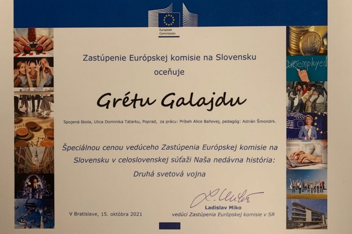 Keďže pandemická situácia pred rokom neumožnila Gréte Galajda prevziať si cenu osobne, stalo sa tak až v polovici tohto októbra. Za úspešnou mladou žurnalistkou pricestoval do Popradu vedúci Zastúpenia Európskej komisie na Slovensku Ladislav Miko, aby jej odovzdal diplom i vecnú odmenu. Grétke k veľkému úspechu tlieskali nielen jej spolužiaci, ale aj riaditeľka školy Mária Vojtaššáková a učiteľ Adrián Šmondrk, ktorý úspešnú študentku v jej práci viedol.