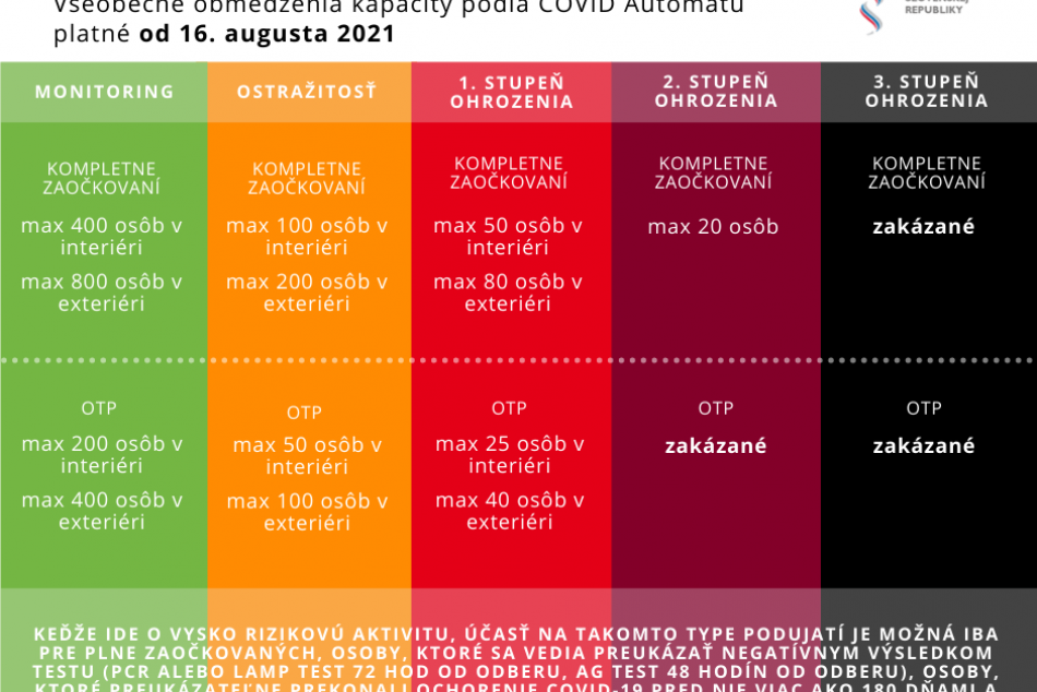 Návštevníkmi budú môcť byť osoby, ktoré sú plne zaočkované, prekonali ochorenie COVID-19 pred nie viac ako 180 dňami, alebo majú negatívny výsledok testu na ochorenie COVID-19. PCR alebo LAMP test nemôže byť starší ako 72 hodín od odberu a antigénový test nemôže byť starší ako 24 hodín od odberu. Úrad pripomína, že potvrdenie o zaočkovanosti, prekonaní ochorenia COVID-19 je možné nahradiť aj digitálnym COVID preukazom EÚ.